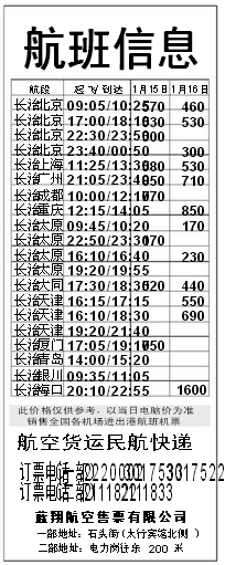 全国各机场进出港航班机票航空货运民航快递 订票电话(一部):2220002 3017533 3017522订票电话(二部):2111822 2111833订票电话(三部):2189268 蓝翔航空售票有限公司 一部地址:石头街(太行宾馆北侧)二部地址:电力岗往东200米三部地址:金威大酒店商务中心 航空货运民航快递