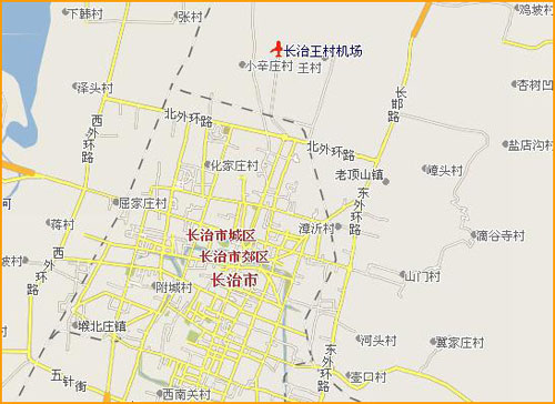 【基本信息】 代码: 长治王村机场三字码:CIH 长治王村机场四字码:ZBCZ 长治机场目前通航城市有:北京、上海、广州、大同、成都 中国国际航空(成都) 中国南方航空(广州) 海南航空 (北京、上海、西安) 长治王村机场位于长治市北7.5千米处,占地面积15万平方米,始建于1958年,现有长2600米的水泥跑道和2600米的水泥滑行道,建有南北远导航台以及指挥、灯光等先进设备,可供各种中、小型飞机昼夜起降,目前属国家二级民航机场,改造后的长治民航机场可起降大型飞机。长治机场复航后,长治再次成为山西省第二航空港,为长治建设中国的强市、扩大对外经济交流和方便市民外出旅游提供更加快捷便利的交通支持。