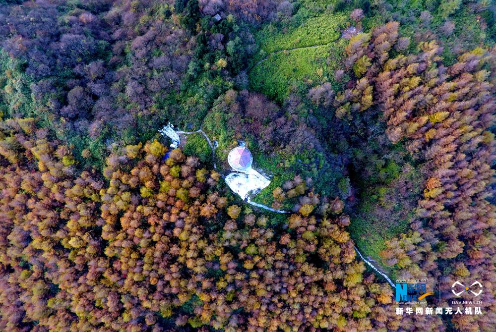 重庆巫山小三峡国家森林公园东岸的梨子坪迎来晚秋胜景。图为从空中远眺,梨子坪森林公园松涛阵阵,一条曲线公路从林中穿插而过,秋色醉人。
