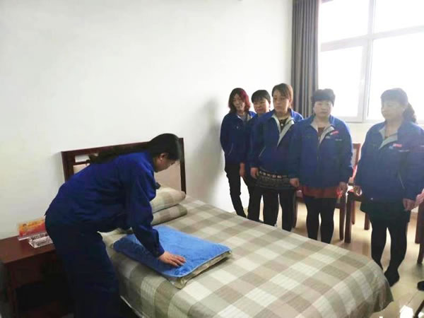 “四分钟!四分钟把被子叠成了豆腐块,叠放达标。”服务人员苗玉萍是公寓队里叠被子最快的女工,她叠的被子四角饱满,可以和军人的水平相媲美,在日常的服务工作中她总会把住户职工的被子叠放成豆腐块,有这样的成绩离不开她平时对自己服务的高要求,日复一日不变的优质服务给住户职工带来家的舒心。