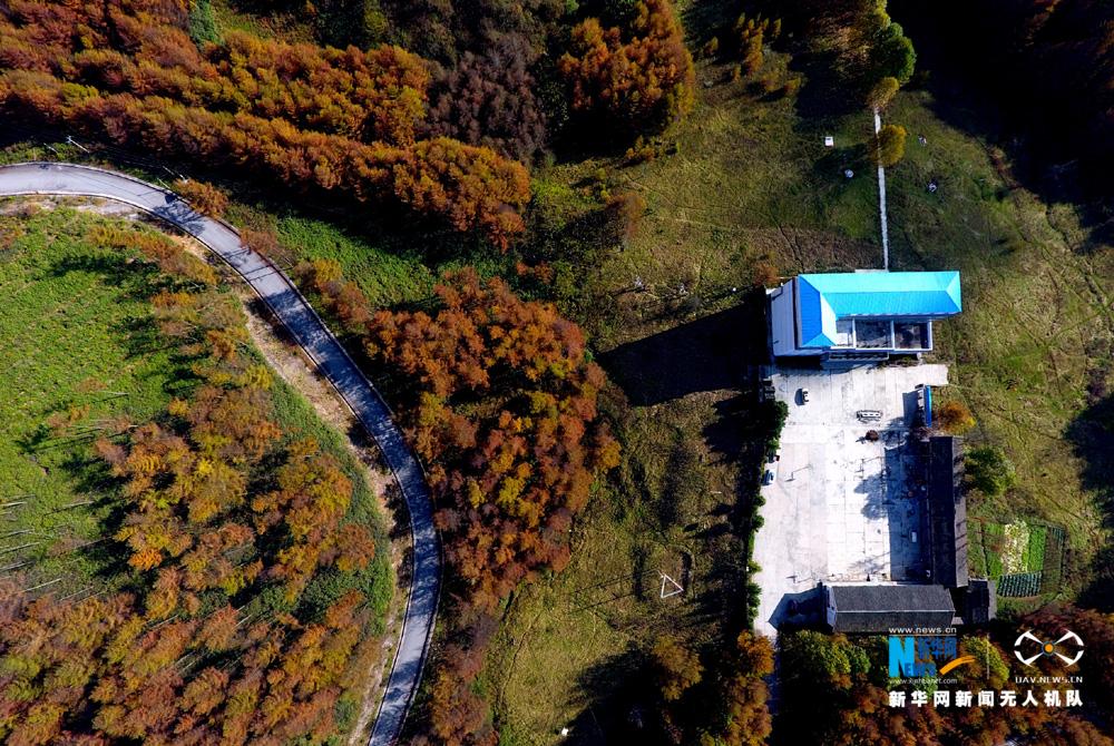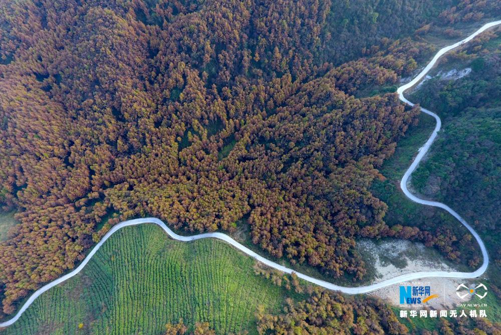 重庆巫山小三峡国家森林公园东岸的梨子坪迎来晚秋胜景。图为从空中远眺,梨子坪森林公园松涛阵阵,一条曲线公路从林中穿插而过,秋色醉人。